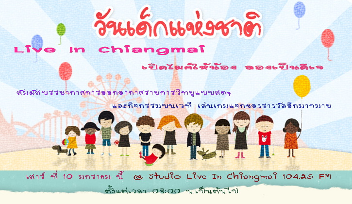 วันเด็กปีนี้ Live FM 104.25  เปิดโอกาสให้น้องๆ ที่มีความใฝ่ฝันอยากเป็นดีเจในอนาคต เข้าร่วมกิจกรรมวันเด็กแห่งชาติกับพี่ๆ ดีเจ Live In Chiangmai น้องๆ จะได้สัมผัสกับบรรยากาศของการออกอากาศของจริง สนุกสนานและได้ความรู้มากมาย ซึ่งเราจะฝึกให้น้องๆ ได้ทดลองพูดออกอากาศกันแบบสดๆ นอกจากนี้ยังมีกิจกรรมบนเวที เล่นเกมแจกของรางวัลอีกมากมาย ติดตามรายละเอียดกิจกรรมได้ที่ www.facebook.com/livefm104.25chiangmai , www.livefm10425.com และ Live In Chiangmai 104.25 FM ทุกช่วงดีเจ