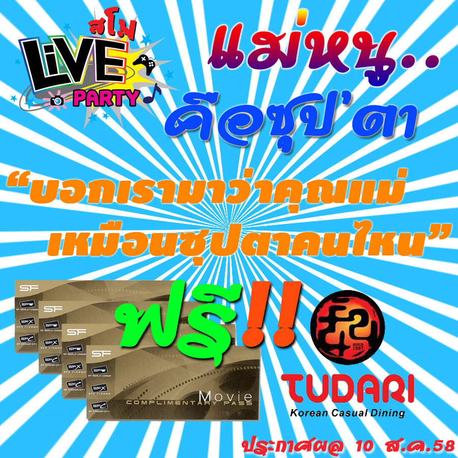 บอกเรามาว่าแม่ของคุณเหมือนซุปตาคนไหน ไทยหรือเทศ แล้วเราจะให้คุณพาคุณแม่ไปดูหนังและอิ่มท้องกันแบบครอบครัว ติดตามรายละเอียดการร่วมสน...