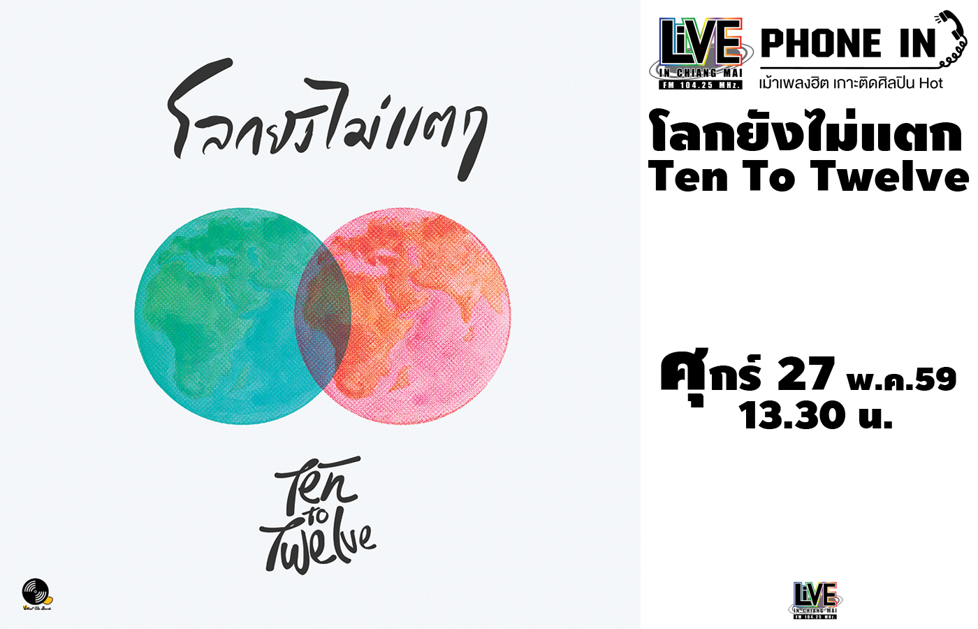 Live Phone In เม้าเพลงฮิต เกาะติดศิลปินฮอต เปิดไมค์ต้อนรับกลุุ่มศิลปิน "Ten To Twelve" มาพร้อมกับซิงเกิ้ลใหม่ "โลกยังไม่แตก" เพลงจ...