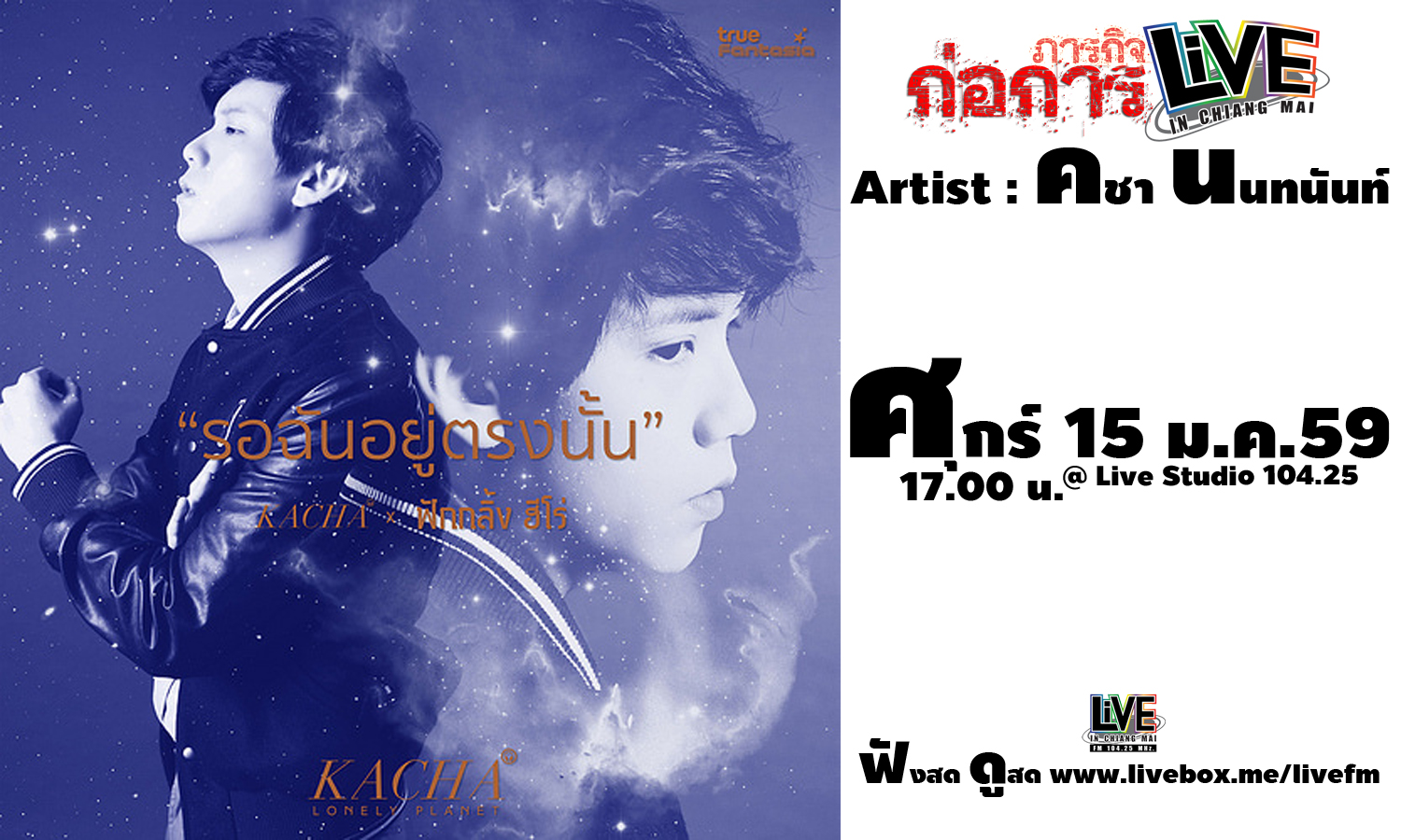 เมื่อวันศุกร์ ที่ 15 ม.ค.59 ช่วงเย็นที่ผ่านมา ภารกิจก่อการ Live เปิดสตูดิโอไลฟ์ต้อนรับศิลปิน "คชา นนทนันท์" มาพูดคุยถึงซิงเกิ้ล "ร...