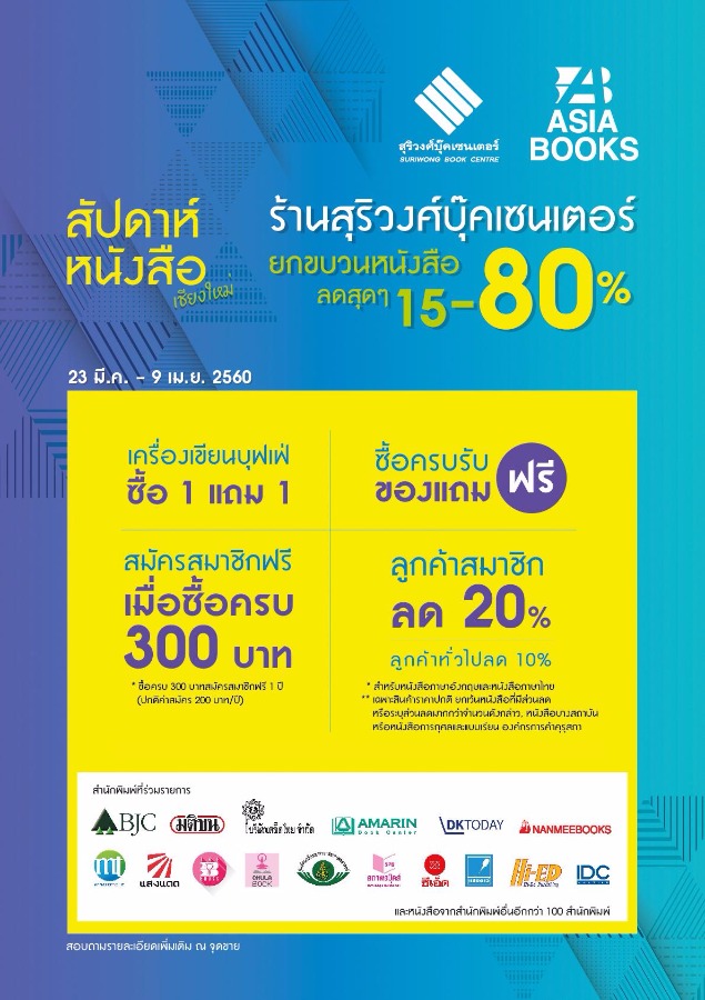 ร้านสุริวงศ์บุ๊คเซนเตอร์ ร้านหนังสือของคนเชียงใหม่ จัดสัปดาห์หนังสือเชียงใหม่ ครั้งที่ 1 ตั้งแต่วันที่ 23 มีนาคม - 9 เมษายน 2560 ยกขบวนหนังสือมากถึง 100 สำนักพิมพ์ เอาใจนักอ่านในจังหวัดเชียงใหม่และภาคเหนือ จัดโปรโมชั่นลดกันแบบสุดๆ ตั้งแต่ 15-80% พร้อมแผนกเครื่องเขียน จัดโปรโมชั่นบุฟเฟ่ต์ 1 แถม 1 และช้อปครบตามเงื่อนไข รับของแถมกลับบ้านกันอีก ติดตามรายละเอียดเพิ่มเติมได้ที่ Facebook สุริวงศ์บุ๊คเซนเตอร์
