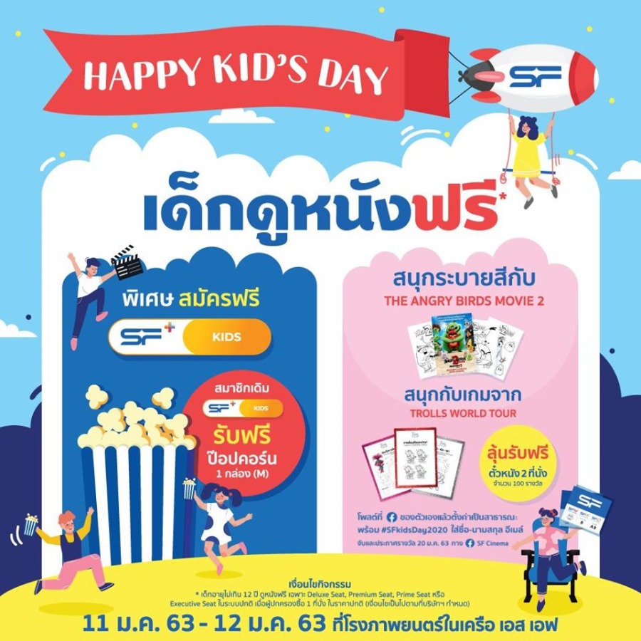 วันเด็กปีนี้ SF ให้น้องๆ อายุไม่เกิน 12 ปี ชมภาพยนตร์ฟรี 1 ที่นั่ง เมื่อผู้ปกครองซื้อบัตรชมภาพยนตร์ ราคาปกติ 1 ที่นั่ง และน้องๆ ยังสามารถสมัครบัตรสมาชิก SF Plus พร้อม Package โปรตาม Gen ประเภท Kids ฟรี และกิจกรรมอื่นๆ อีกมากมาย สอบถามรายละเอียดเพิ่มเติมได้ที่ SF Cinema Smart Call 1349 และ www.sfcinemacity.com